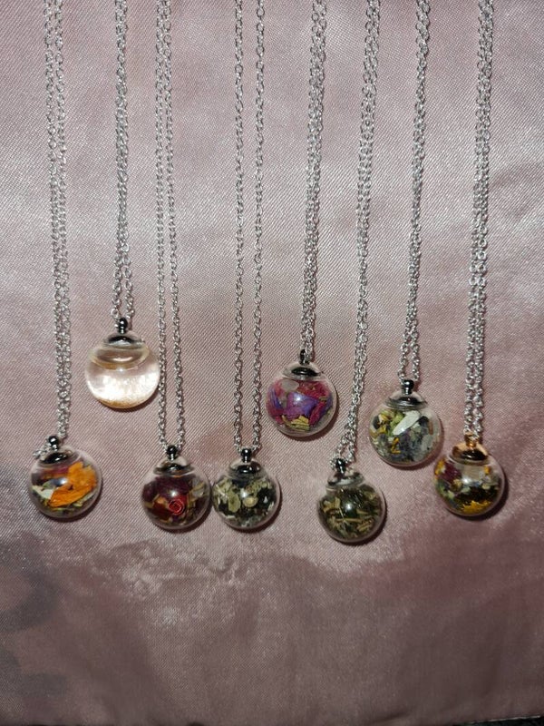 Handmade spell necklaces filled with dryed herbs, flowers , salts ,crystals and more .