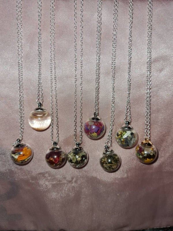 Handmade spell necklaces filled with dryed herbs, flowers , salts ,crystals and more .